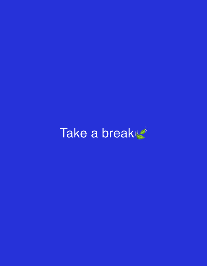The image displays a solid blue background. Centered horizontally, white sans-serif text reads "Take a break." Immediately adjacent to the right of the text is a green leaf emoji, composed of two overlapping green leaves. No human figures, specific physical objects beyond the text and emoji, direct actions, or interactions are visually depicted within this abstract graphic scene, which is associated with the city of Rishon LeZion, Israel.