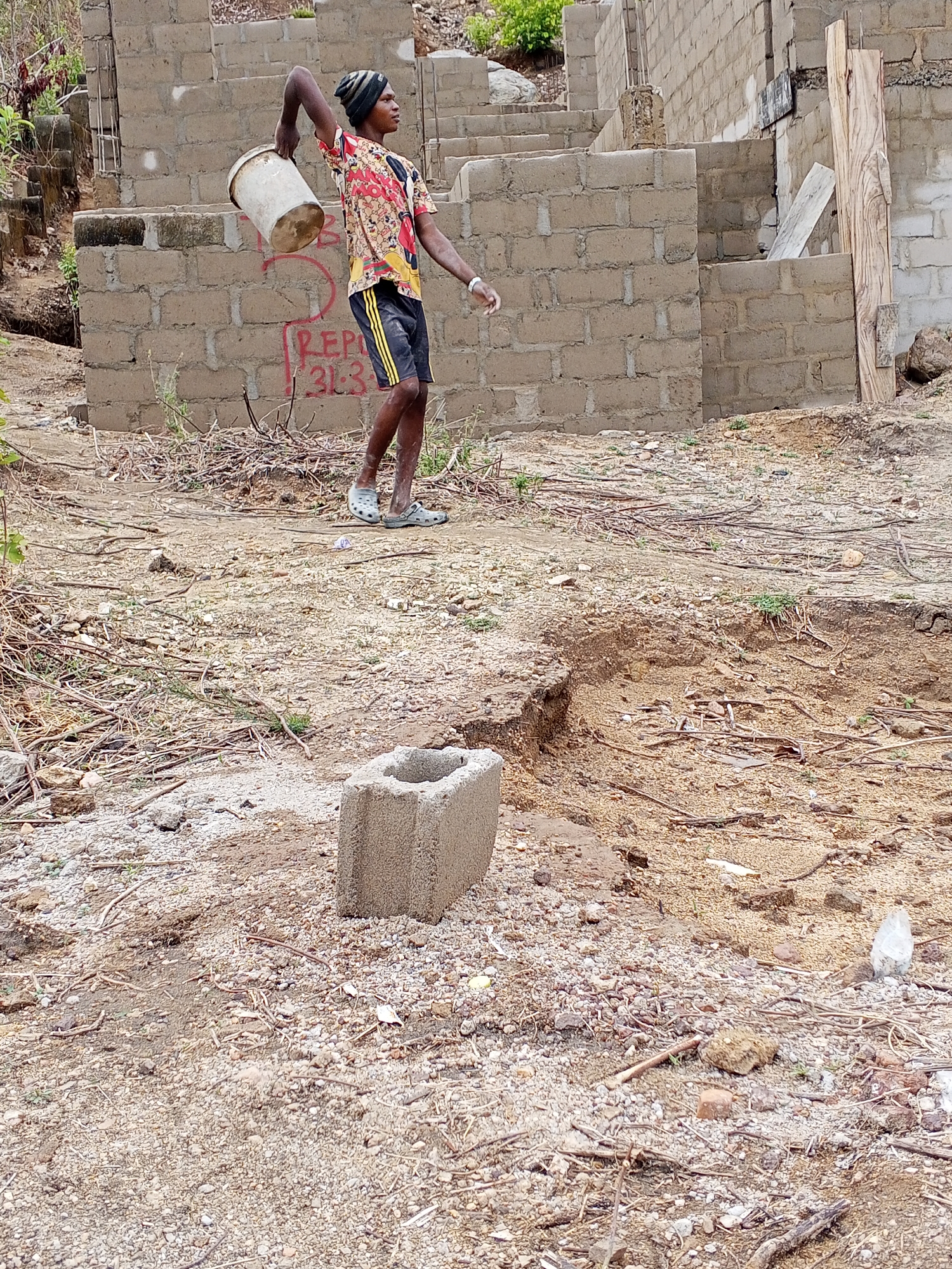 A man in a patterned shirt, dark shorts with yellow stripes, and a cap is throwing the contents of a white bucket in the air. He is standing on a dirt surface littered with twigs, in front of a partially constructed building made of grey blocks. A hollow rectangular block sits on the ground in the foreground. The location is likely a construction site in a hilly area within the city of Lokoja, Nigeria.
