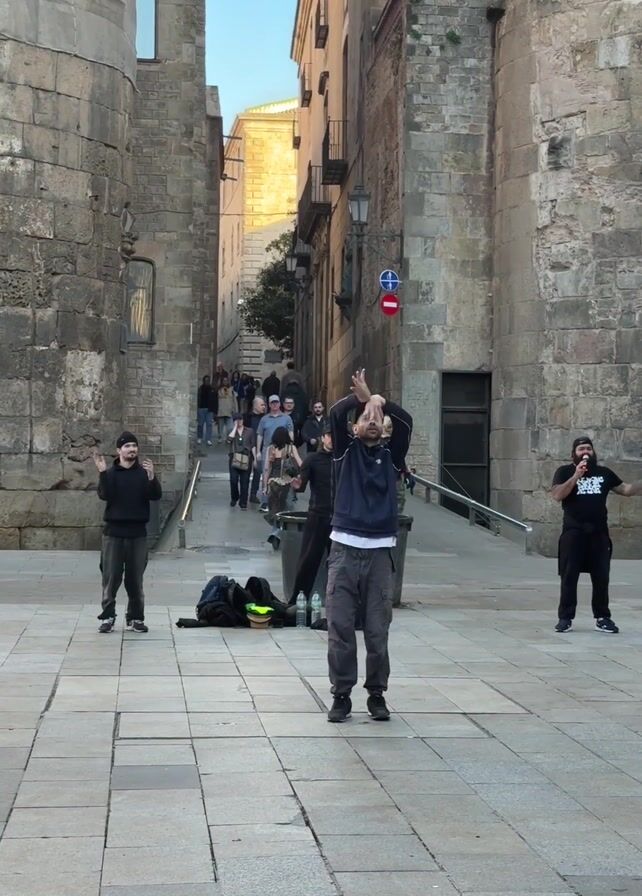 In a wide, low-angle shot, three street performers provide entertainment for passersby in a narrow plaza or street. The main performer, located in the center of the frame, wears a navy blue sweatshirt over a white t-shirt and grey cargo pants, and is dancing. He is surrounded by the other two performers: one to the left, wearing a black hoodie and pants, who appears to be playing an instrument such as a hand pan; and another on the right, who is dressed in black and appears to be providing vocals through a microphone. They are surrounded by their equipment, including a black backpack, a green item, and water bottles. In the background, a crowd of people walks down a slight incline away from the camera, and the architecture features old stone buildings on both sides, creating a narrow passageway. A red and white traffic sign is visible. The overall setting suggests an urban environment with historical architecture. The lighting is bright and even, suggesting it may be early afternoon.