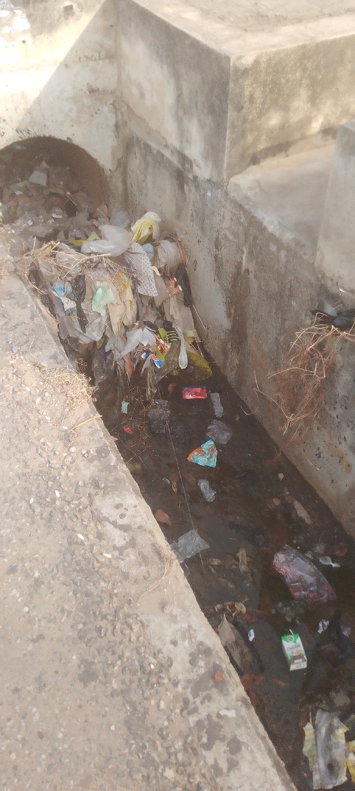 This image depicts a severely obstructed concrete drainage channel in Adankolo, Nigeria