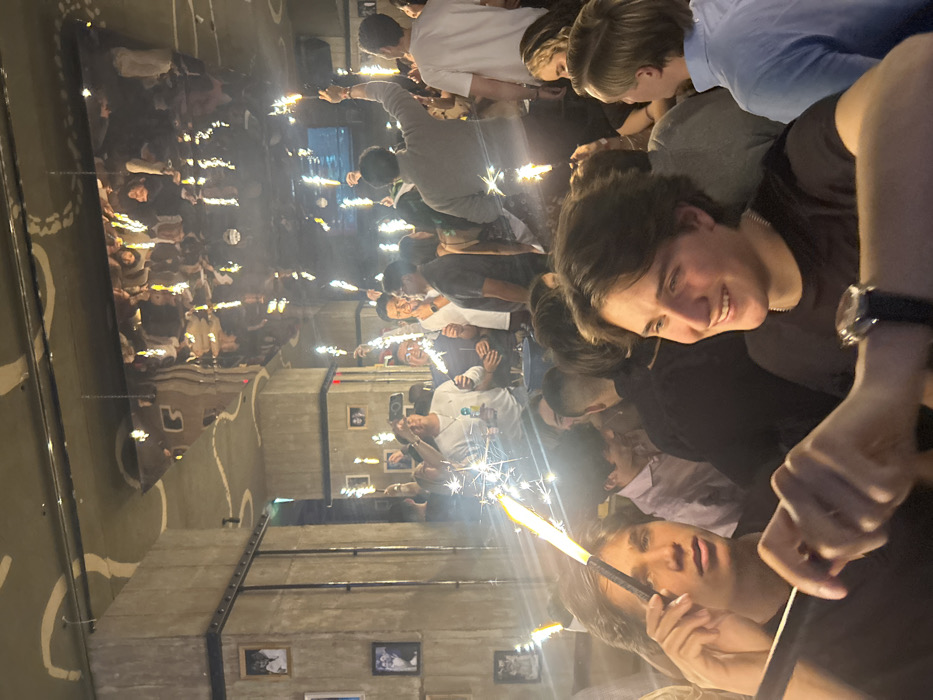 A group of people celebrate with sparklers in a dimly lit space. Two young men are visible in the foreground, one smiling at the camera while holding a sparkler. The background shows other individuals also holding sparklers, their reflections distorted on a polished ceiling. Pictures adorn the wall, adding to the room's ambiance. The scene suggests a festive or celebratory event within a bar or nightclub setting.