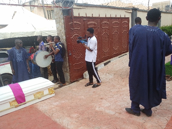 The scene depicts an outdoor gathering on a paved residential property in Lokoja, Nigeria. In the immediate foreground, a white casket, adorned with a magenta sash and gold-colored trim on its sides, rests on a reddish-brown paved surface. To the left of the casket, a man in a blue traditional garment stands facing right. Behind the casket and to the left, a group of four individuals is partially visible near a white tent and a white vehicle. Within this group, two men are actively playing musical instruments: one is positioned with a large, light-colored drum, and another holds a trumpet to his mouth. Central to the image, a man wearing a white short-sleeved shirt, black-and-white striped athletic pants, and dark sandals operates a black video camera, pointing it towards the casket and the group of musicians. Behind him, a tall, dark brown double-leaf gate with ornate, symmetrical patterns is prominent, set within a light-colored stone wall topped with barbed wire. To the right, another man, dressed in a dark blue traditional garment, stands with his back to the viewer, facing towards the gate and the central activity. The ground transitions from reddish-brown to lighter-colored paving stones in the mid-ground and right. Green foliage is visible beyond the gate and in the far right.