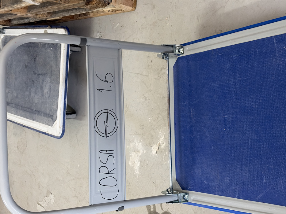 The scene depicts a grey metal hand truck with a blue textured platform, positioned on a light grey concrete floor in Haskovo, Bulgaria. Affixed to the upper handlebar of the hand truck is a white rectangular label bearing the handwritten black text "CORSA," followed by the Opel automotive brand logo, and then the numbers "1.6." The hand truck's blue platform features a diamond pattern texture and is framed by a light grey border. In the background, another similar hand truck with a dark blue platform and a white border is partially visible, along with a portion of a wooden pallet consisting of stacked slats to the right. The concrete floor exhibits scattered white debris and various scuff marks.