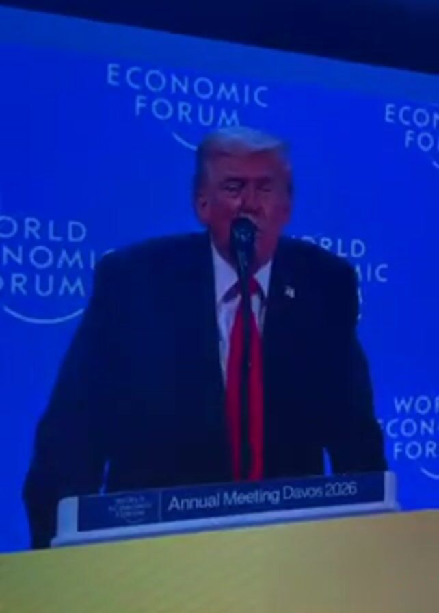 Donald Trump speaking at a podium at the World Economic Forum's Annual Meeting in Davos 2026