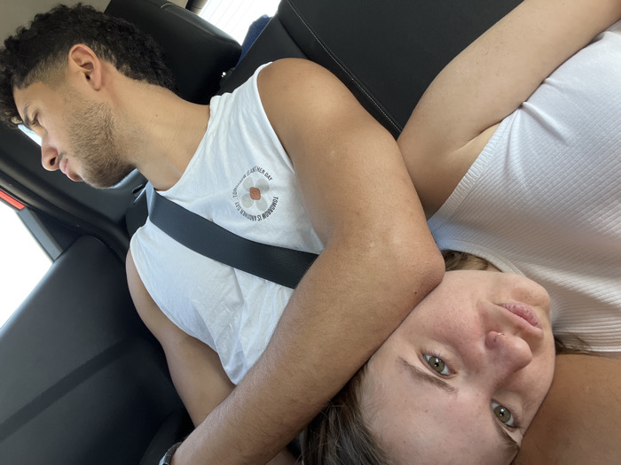 A forensic examination of the image reveals two individuals, a male and a female, situated within a vehicle in the Nahal Sorek Regional Council, Israel. The male, positioned on the left, is a young adult with dark curly hair styled in a mullet, stubble on his face, and eyes closed, indicating sleep or rest. He wears a white sleeveless tank top featuring a graphic of a daisy and the text "TOMORROW IS ANOTHER DAY." A black seatbelt is fastened across his chest, and a silver-colored watch is visible on his left wrist. The female, positioned on the right and closer to the viewer, is a young adult with light skin, brown hair, and green/hazel eyes, looking directly at the camera with a neutral expression. She has a small nose piercing and wears a white ribbed tank top. Her head is resting on the male's right bicep, and her left arm is bent, resting near her head. The interior of the vehicle is visible, primarily black car seats and headrests, with natural daylight illuminating the scene from the left, revealing a faint red object outside a window. The overall interaction suggests an intimate or relaxed state between the two individuals.