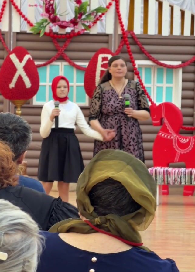 Two women stand on a stage, each holding a microphone, and addressing an audience. The woman on the left is younger, wearing a red hijab, a white top, and a black skirt. The woman on the right wears a floral dress. They stand close to each other. In the background is a decorative backdrop resembling a log cabin with red garlands, large red egg-shaped decorations bearing white letters, and a red decorative horse. The audience is seen from behind, seated on wooden chairs. Many of the audience members are elderly women, some wearing head coverings.