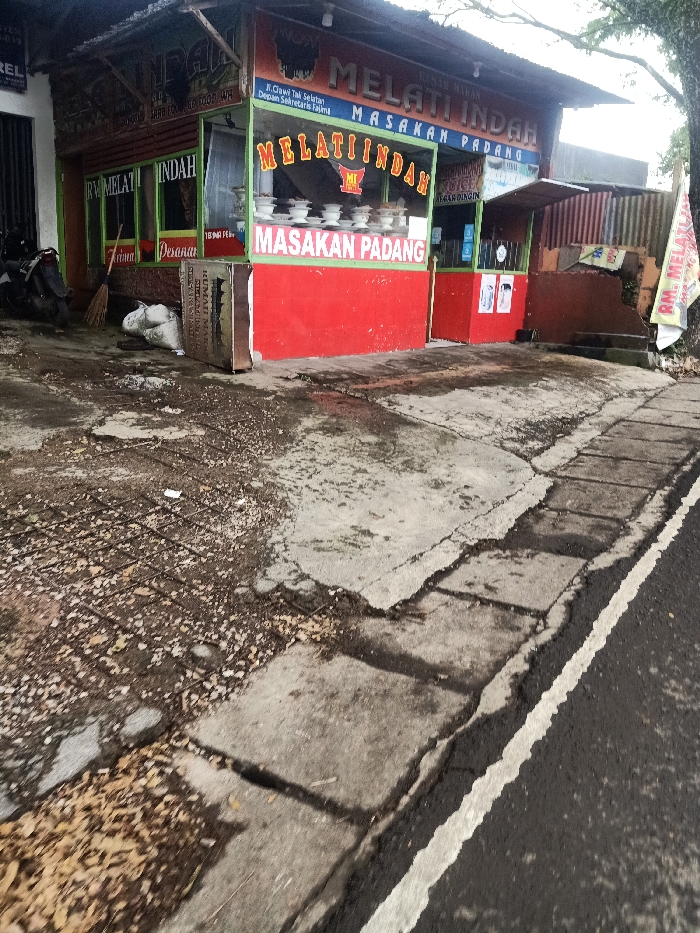 A small, slightly dilapidated restaurant named "Melati Indah Masakan Padang" is visible. It is a roadside eatery with a red and green facade. A sign above lists its address as "Jl. Clawi Tak Selatan". A display case holds plates of food. The area in front of the restaurant is cracked and uneven concrete. A motorcycle is parked nearby. The image appears to be taken from the street, with a sidewalk and the road edge visible.