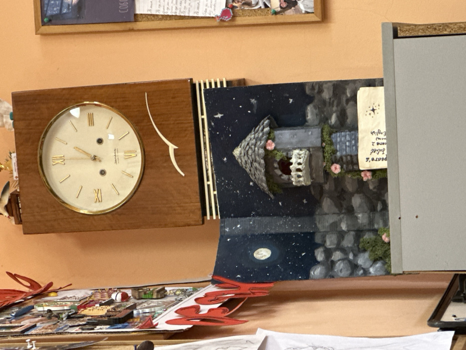 An indoor scene displays a cluttered wall and a surface below. A light orange/peach wall serves as the background. Centrally positioned on the wall is a rectangular wooden Jantar clock with a circular brass-rimmed face, white dial, and Roman numerals (IV, VI, XI visible). The clock features the text "Jantar made in USSR" and a white stylized seagull decal below the face. Horizontal light-colored slats are present beneath the clock's main body. Directly below the clock, resting on a grey cabinet or shelf, is an open, book-style diorama depicting a night scene. The left panel shows a dark blue sky with painted stars and a prominent full moon over a grey stone wall. The right panel features a three-dimensional model of a grey stone turret with a shingled roof, adorned with green moss and pink flowers, and a white, ornate balcony. Its background mirrors the night sky and stone wall. A small, folded piece of paper stands on the diorama's base, displaying handwritten text including "peare's", "Juliet", "scene 2", and "English". To the far left, a vertical section of a crowded display board is visible, featuring various papers, cutouts (including red letters), and small objects. White sheets of paper hang below this display. To the far right, a cork bulletin board is partially visible, holding papers secured with red thumbtacks and a photograph of two individuals. Cyrillic text, "СОБОЛ", is discernible on one of the pinned papers. The objects and their arrangement are consistent with an indoor setting within a building in the city of Razgrad, Bulgaria, such as a classroom or a personal study area.
