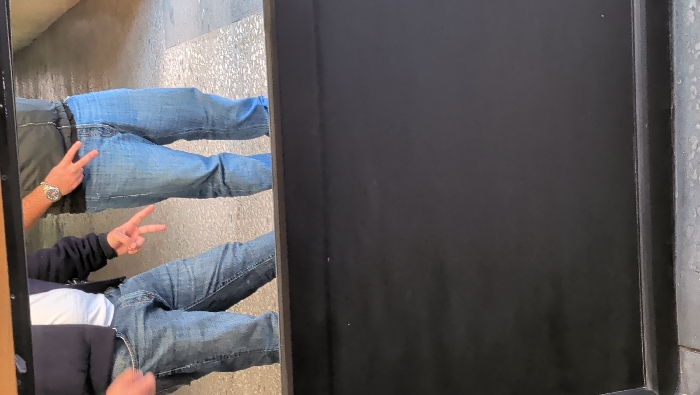 - "The image displays the reflection of two individuals, visible from approximately the waist down, captured in a dark, flat, reflective surface that occupies the lower half of the frame" by FM-fwmFI2, licensed under CC BY 4.0
