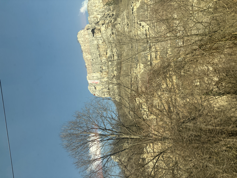 The image displays a panoramic landscape in Gara Lakatnik, Bulgaria, under a clear blue sky. A prominent, multi-layered limestone cliff face dominates the mid-to-background, exhibiting distinct horizontal strata of light beige and grey rock. A large, rectangular flag is affixed to the upper left section of the cliff, displaying vertical red and white stripes. The foreground and lower midground are densely populated with numerous deciduous trees and shrubs, their branches bare and brown, indicating a winter or early spring season. No individuals are visible. A thin, dark horizontal wire traverses the upper portion of the frame, suggesting proximity to infrastructure.