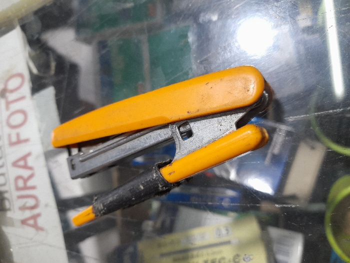 A gray metallic plier-style stapler with orange plastic grips is positioned diagonally on a reflective, transparent surface, oriented from lower-left to upper-right. The left-side orange grip of the stapler is partially wrapped with black tape. The stapler exhibits minor wear. The background is out of focus, revealing a red and white sign displaying the text "AURA FOTO" and indistinct colored objects, including hints of green and blue. The scene is located in Wedoro, Indonesia.