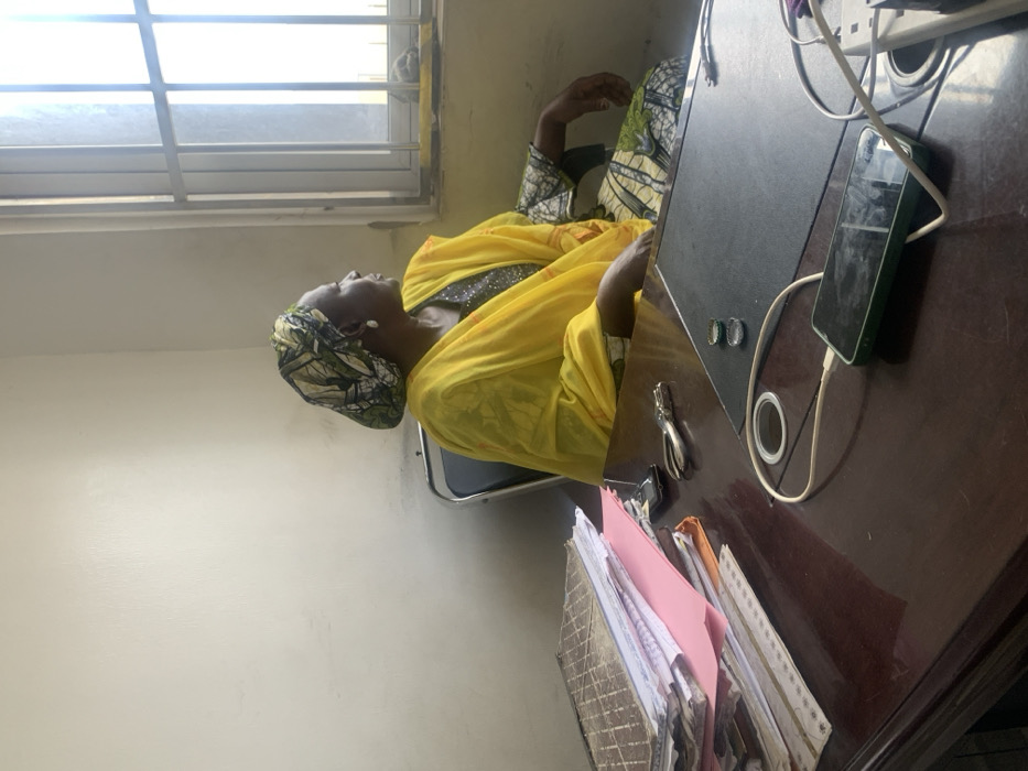 An indoor scene depicts an adult female seated at a dark wooden desk, facing right and looking towards a barred window. She wears a multi-patterned headwrap, a bright yellow shawl over a darker patterned garment, and pearl-like earrings. Her left arm rests on the armrest of a black office chair. The room has light-colored walls exhibiting some scuff marks. On the desk, a tall stack of documents, files, and a large patterned ledger is visible on the left. In the center, a silver-colored hole puncher, two metallic bottle caps (one green, one silver), and a roll of white tape are present. A dark-cased smartphone is connected to a white charging cable, which extends to a white power adapter on the far right. The window on the right has vertical and horizontal security bars, admitting bright natural light; an indistinct dark object rests on the exterior sill. The specific location within Lokoja, Nigeria, cannot be determined from the visual evidence provided.