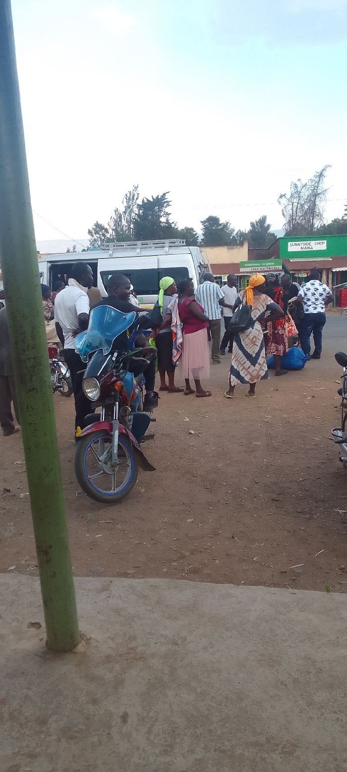The scene is in Kakunga, Kenya, at the coordinates latitude 0.377, longitude 34.854. A group of people are gathered around a white van. Several people are standing near a motorcycle with a blue windshield. Several other people are walking away from the van and motorcycle. There are several trees in the background. In the distance, there are small buildings with signage. The ground is dirt and there is a green pole in the foreground. The sky is mostly clear. The people appear to be waiting for or getting off the van. There are no obvious signs of distress or conflict in the scene.