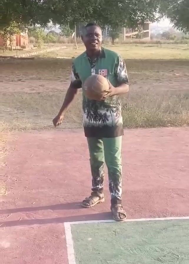 A man stands on a worn red and green basketball court holding a ball. He is wearing a green short sleeve shirt and green pants, both with a palm tree pattern, and sandals. Behind him is a grassy area with trees and a building in the background. He is looking at the camera and appears to be talking, gesturing with his free hand. The lighting suggests it is daytime.