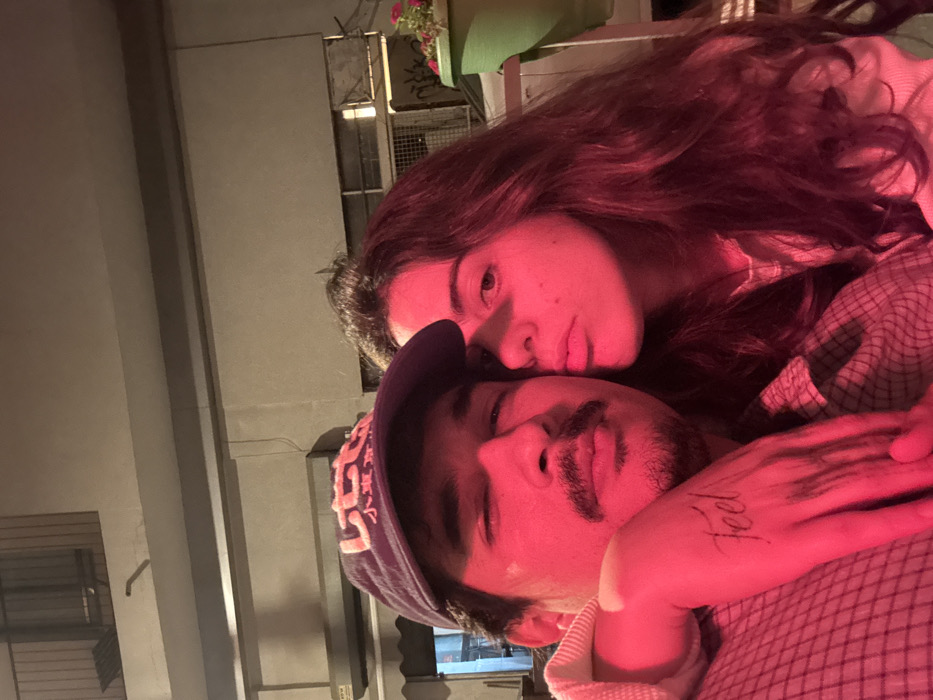 A photo depicts a man and woman, likely a couple, in close embrace. The woman has long, wavy hair and is positioned behind the man, resting her head near his. The man wears a baseball cap. A tattoo that reads "feel" is visible on the man's hand which is on the woman's shoulder. The photograph appears to be taken outdoors at night under red light. A building wall and balcony with greenery are visible in the background. The image is slightly rotated counter-clockwise.