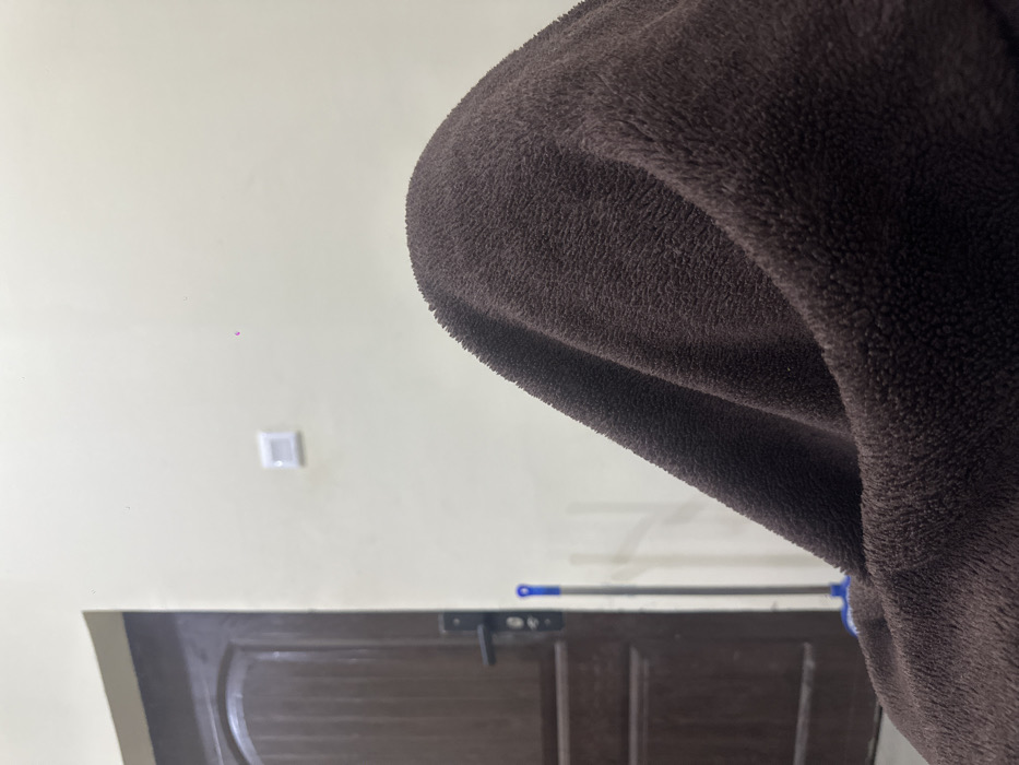 A close-up captures a brown, fuzzy fabric, possibly clothing, dominating the right side
