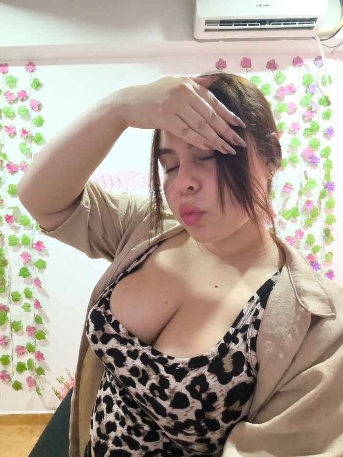 A female subject is depicted indoors, located in the city of Juan Griego, Venezuela. She has brown hair, with some strands falling across her face, and her eyes are closed or partially closed. Her lips are pursed in a pouting expression. Her right hand is raised to her forehead, fingers slightly splayed, revealing light-colored fingernails. She is wearing a leopard print top, with significant cleavage visible, and an unbuttoned light beige or tan overshirt draped over her shoulders and chest. The background consists of a white wall decorated with two vertical garlands of artificial foliage featuring pink flowers and green leaves. An indoor air conditioning unit is mounted high on the wall in the upper right portion of the frame. A faint, light pink decorative element is partially visible on the wall behind the subject's head. A dark, unidentified object is visible in the lower left foreground.