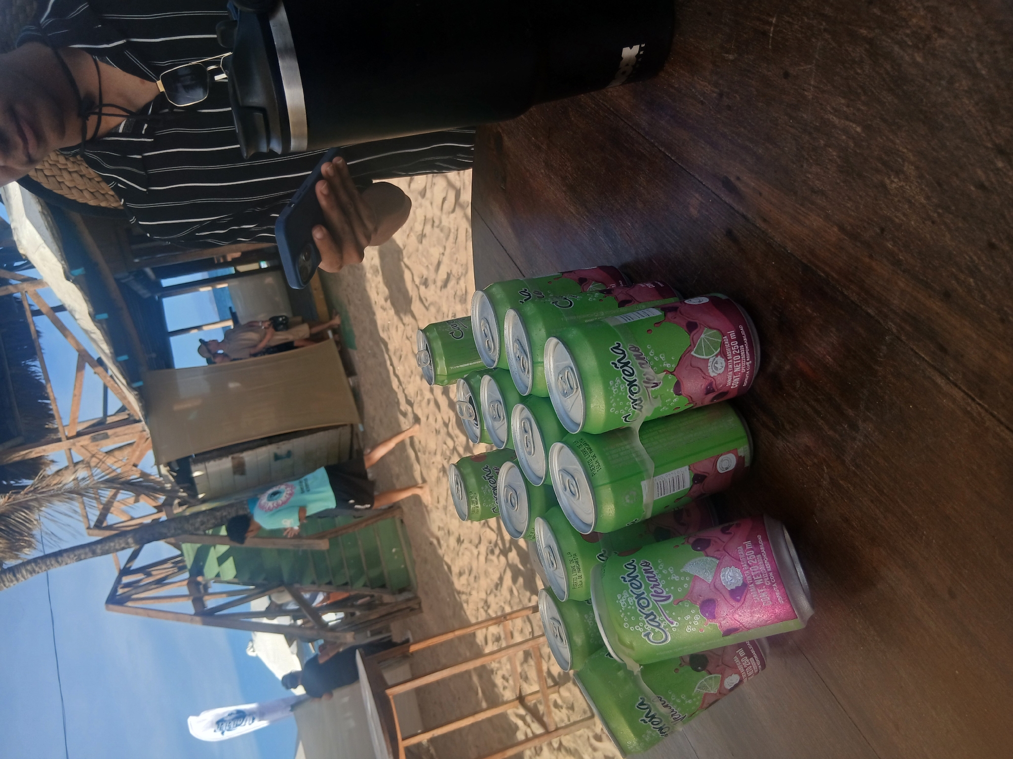 scene at Playa Parguito, Venezuela. A person in a striped shirt and sunglasses is holding a black phone and a black cup, standing next to a wooden table on which is a stack of Caroreña Verano blackberry-flavored wine cans. In the background, the beach is visible with sand, people, wooden structures including a palm tree, and a white surfboard.