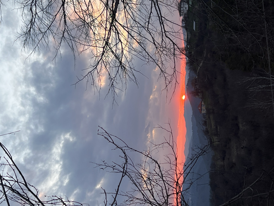 The image presents a panoramic view of a sunset over a hilly, semi-residential landscape identified as Svetulka, Bulgaria. The sky is partially overcast with grey and purple clouds, transitioning to vivid orange and pink hues near the horizon. The sun, a distinct orange-red orb, is centered on the horizon line, emitting a strong red-orange glow across the lower sky. Multiple layers of dark, undulating hills and mountains are silhouetted against the sunset. In the midground, two separate residential structures are visible on elevated terrain: one on the left featuring a red-tiled roof and light-colored walls, and another on the right exhibiting light-colored walls and a darker roof, positioned near a white utility pole. The foreground and upper portions of the image are framed by numerous bare, dark tree branches, indicating deciduous trees without foliage. No individuals or specific actions are identifiable within the scene. The environment is characterized by natural topography with scattered human habitation under twilight conditions.