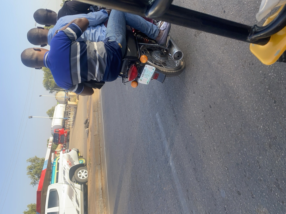 The image displays a daylight street scene in Television, Abuja, Nigeria. In the mid-ground, a dark-colored motorcycle travels away from the viewer, carrying three adult males. The driver wears a blue and grey horizontally striped polo shirt, while the first passenger wears a light blue shirt and blue jeans. The motorcycle's rear is visible, showing a red taillight, amber turn signals, and a license plate reading "ABUJA 00J-51UG". To the left of the road, a white pickup truck, identified as a Mitsubishi Triton/L200, is parked or stationary with its rear-left wheel appearing flat or replaced with a spare. Behind the pickup truck, a gas station with a red and blue canopy is visible, bearing the partial name "O.A.A.R.I". Two tanker trucks, one red and one white, are present at the gas station. The environment consists of an asphalt road, a concrete curb, and sparse trees under a clear, bright sky.