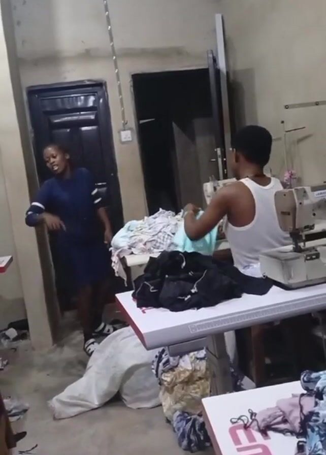 A woman in a blue dress gestures expressively while speaking in a cluttered room, while a man wearing a white tank top sits at a sewing machine, actively using it. The room appears to be a workshop with at least two sewing machines, fabric scraps and bags scattered around, and unfinished walls.
