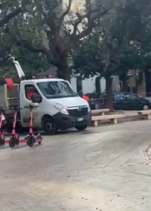 city square with trees. A fountain is in the foreground, and behind it is a street with cars parked along it. A white truck with a crane is parked in the square, with three pink scooters lined up in front of it. A person in a cherry picker is trimming the trees, and the truck bed is filled with branches. Another person with dark curly hair is walking through the square.