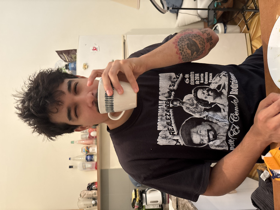 - "An adult male with dark, disheveled hair and a mustache is depicted from the chest up, squinting or closing his eyes while drinking from a white ceramic mug with a vertical blue stripe pattern" by FM-wUaYc2, licensed under CC BY 4.0