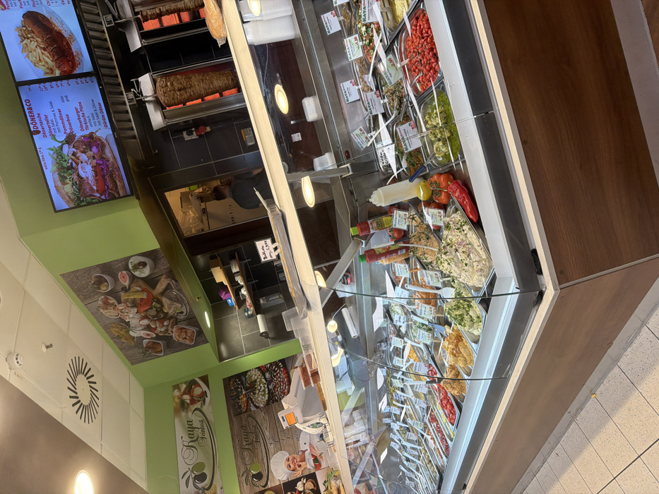 A well-lit fast food restaurant displays a menu board showing images of Döner sandwiches and plates