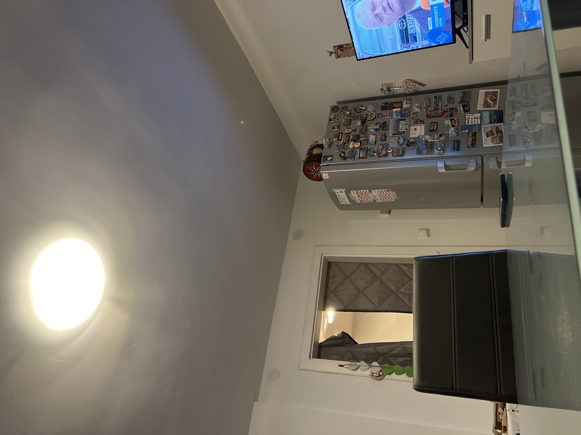 This image depicts an indoor scene, specifically a residential area, located in Benningen, Germany. The perspective is from a seated position at a reflective dark-surfaced table, possibly glass, which occupies the lower third of the frame and shows reflections of the ceiling light and television. The primary light source is a prominent, bright circular ceiling light positioned in the upper center. The ceiling and walls are white. On the upper left wall, above a doorway, two circular, white speaker-like fixtures are mounted. In the immediate foreground, a dark, possibly black, chair back is visible, facing away from the viewer. A dark-cased smartphone rests horizontally on the table surface to the left of the chair. To the right, a silver-colored refrigerator stands against the wall, heavily adorned with numerous souvenir magnets and a few paper items, including what appears to be a calendar. A decorative cylindrical object with a star or compass design on its lid, along with another small container, rests on top of the refrigerator. Further right, a black flat-screen television is displaying what appears to be a news broadcast. The screen shows a close-up of a Caucasian man's face, with light hair, looking towards the right. Partial Cyrillic text ("НОВИНИ," meaning "News") and a vehicle with "POL" visible (suggesting police) are also displayed on the screen. The television is supported by a white, low-profile cabinet. To the left, a doorway leads into an adjacent room, partially obscured by a dark grey, quilted curtain or divider. A light source is visible within the room beyond the doorway. A decorative hanging item composed of multiple grey heart-shaped elements is suspended near the doorway. No individuals are actively present or interacting within the immediate captured space; the visible person is an image on the television screen.
