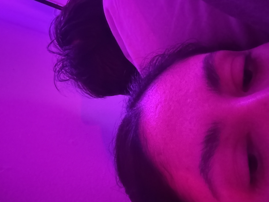 A person's face, predominantly illuminated in pinkish-purple hues, is partially visible. The forehead, eyebrows, and a glimpse of the eyes can be discerned. Dark hair is seen, with some strands near the forehead and a larger mass positioned above the head. A white cloth is partly visible behind the hair. The composition is angled, offering a close-up perspective of the person's facial features.