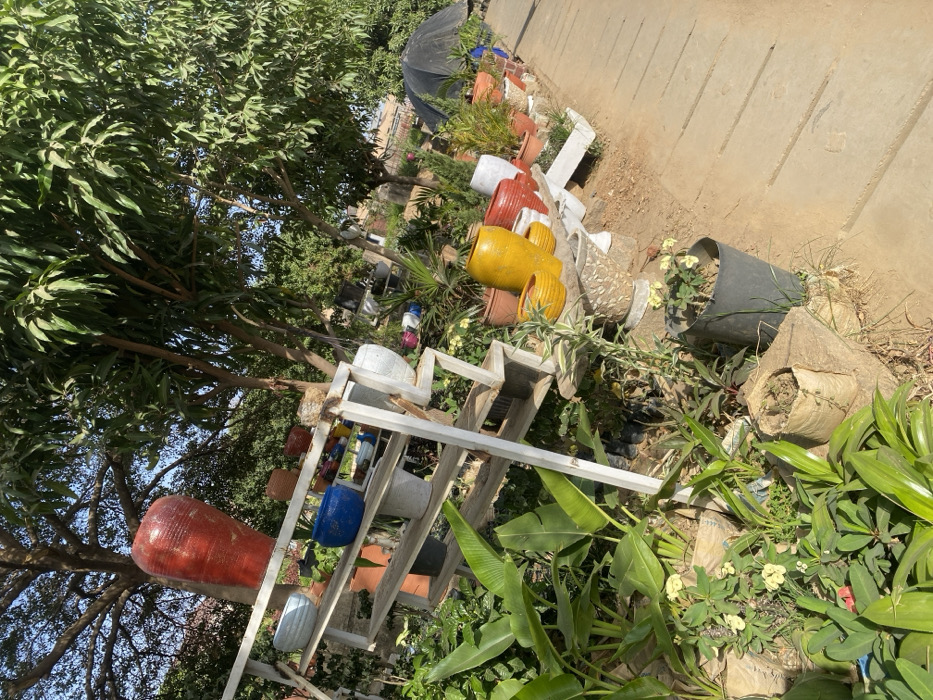 This image depicts an outdoor plant and pottery stall, located in Kaduna, Nigeria