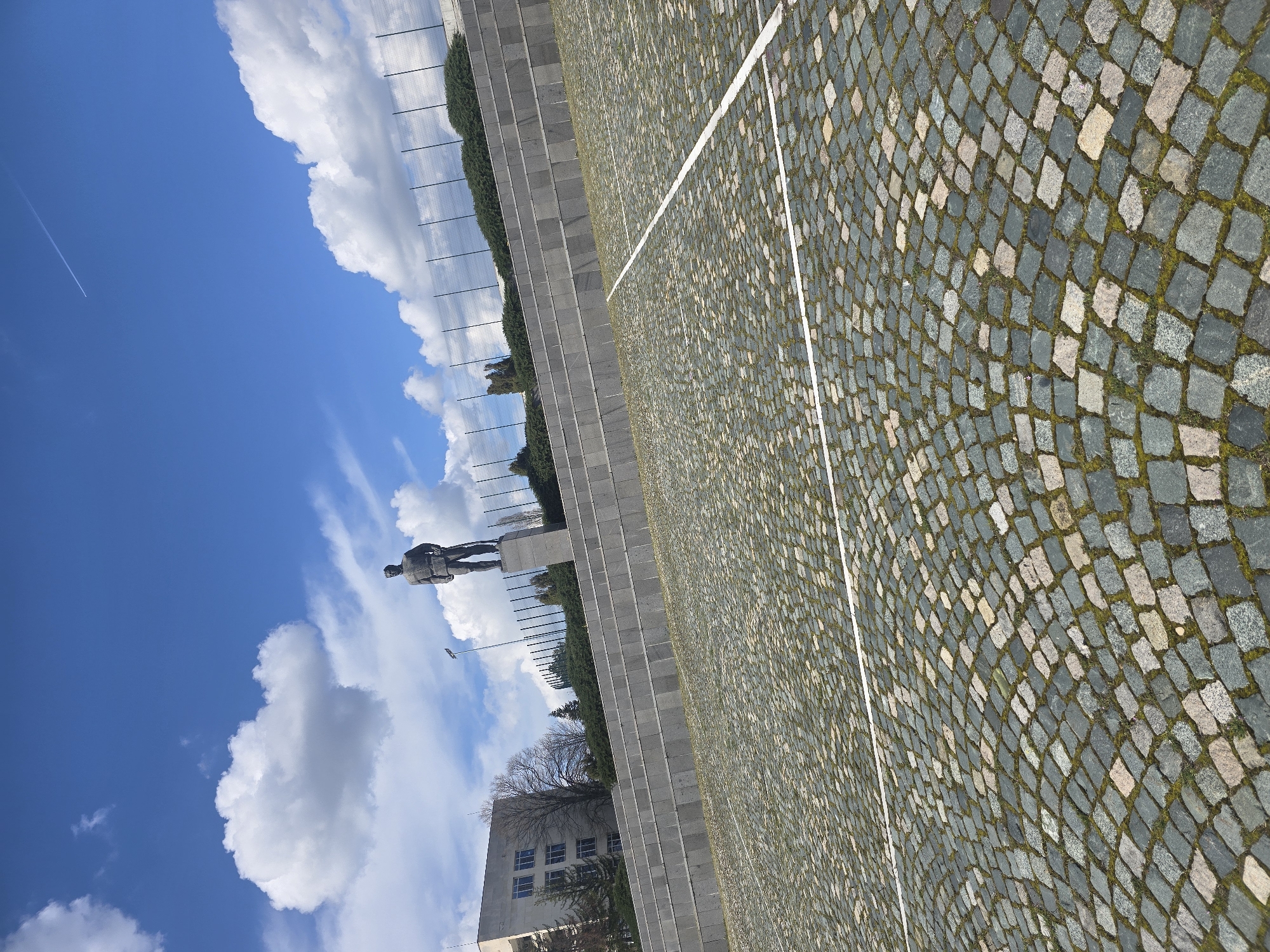 Monument to the Asenevtsi in Veliko Tarnovo, Bulgaria, on a sunny day. The monument is a large sculpture of four historical figures standing on a platform, against a backdrop of a blue sky with fluffy white clouds. The ground is paved with cobblestones, with a white line marking a path or boundary. A building can be seen in the distance.