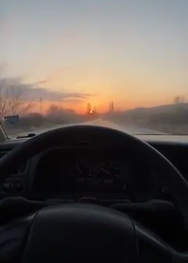 view from inside a car driving on a straight road at sunset