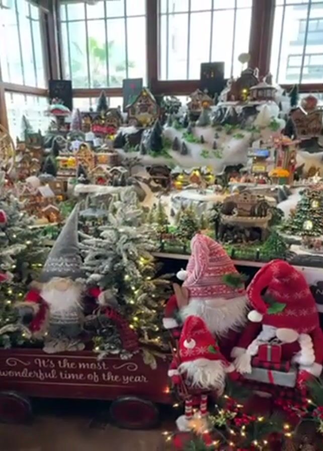large Christmas display featuring a miniature winter village with houses, snow-covered mountains, and trees. In the foreground, there are several gnomes of different sizes and colors, standing next to snowy Christmas trees and a red wagon with the inscription "It's the most wonderful time of the year." The display is set up indoors, with large windows providing natural light and a view of buildings outside. The miniature village has lights illuminating the houses and scenery.