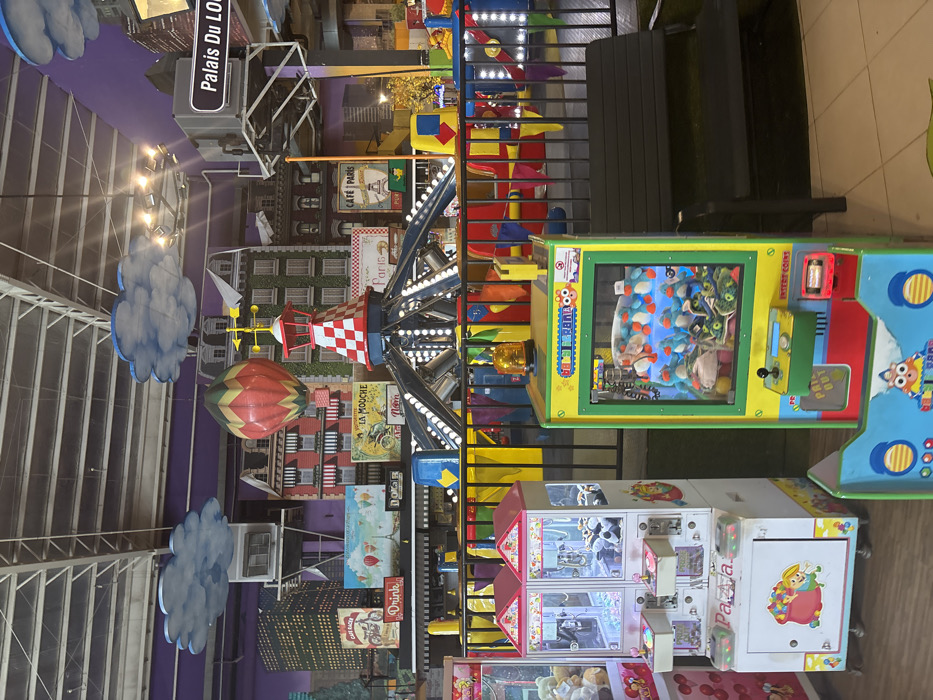 n indoor children's play area located in a shopping mall in Kecamatan Sidoarjo, Indonesia, with coordinates -7.44, 112.715. In the foreground, there are three arcade games with various stuffed animals as prizes. The games are set up against a black metal fence, which separates them from the rest of the play area. To the right, there is a black bench. The background depicts a colorful cityscape with buildings, a balloon, and a carousel. The carousel is a central attraction and appears to be a spinning ride with various bright colors. It is decorated with cartoon characters and colorful lights. There are no people in the scene. The lighting is bright and fluorescent. The overall ambiance is one of a cheerful and fun-filled children's play area.