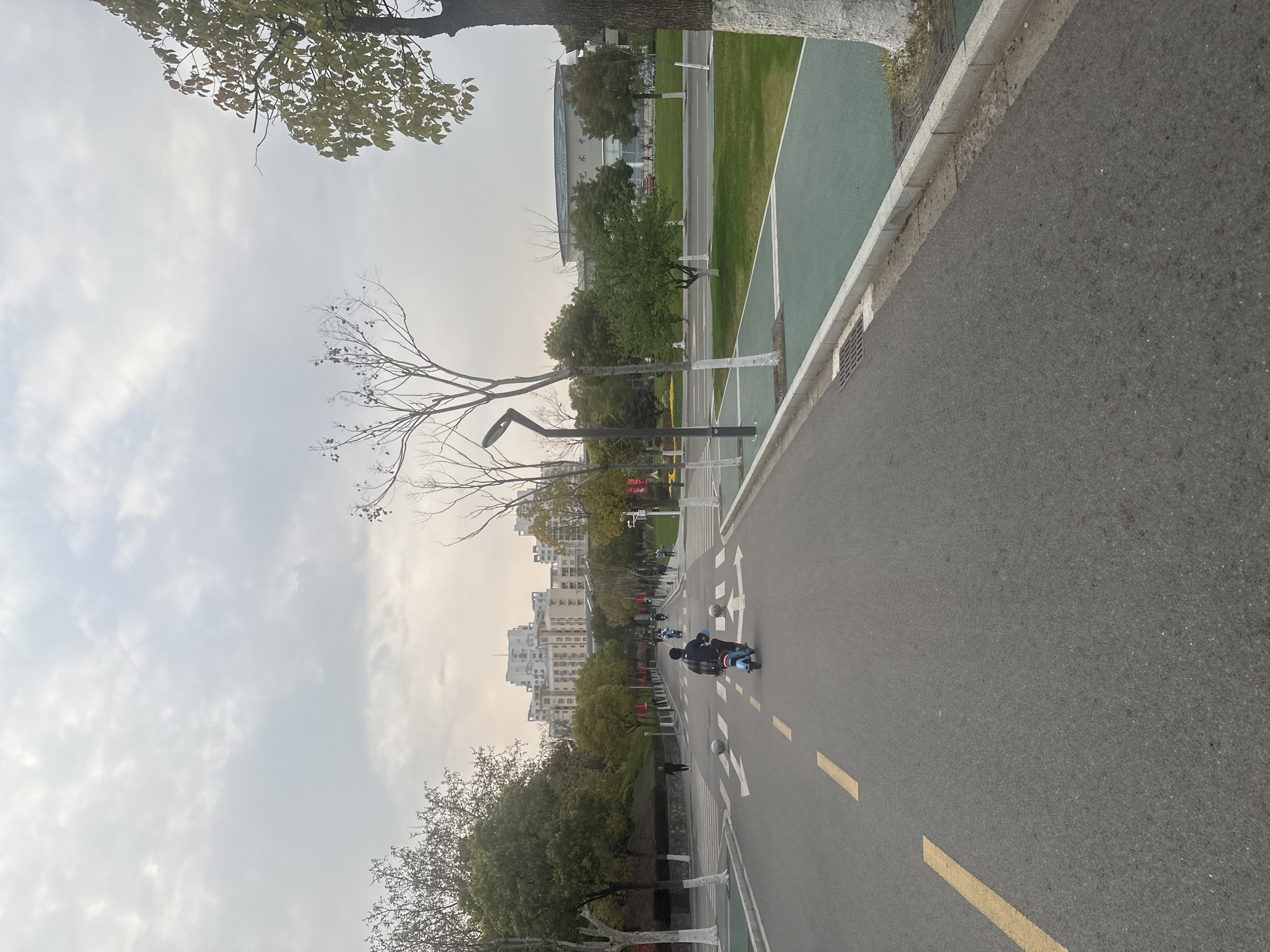 The image displays an asphalt roadway in Jiangning District, China, under an overcast sky. A person wearing a dark jacket with a plaid pattern on the back is operating a light blue electric scooter, moving away from the viewer on the right side of the road's center line. The road features broken yellow center lines, white directional arrows (straight and right turn), and a zebra crossing delineated by two spherical concrete bollards. Multiple individuals are visible in the distance, either walking on paved pathways or riding additional scooters. To the left of the roadway, a paved path is bordered by a low wall and a densely treed embankment, with several multi-story, light-colored buildings presenting varied architecture in the background. Red banners are intermittently positioned along this left pathway further down. To the right, the asphalt road is bordered by a concrete curb, adjacent to which is a green-surfaced path, followed by a grassy median strip. Trees with light-colored (likely white-painted) trunks are situated along both sides of the road. Modern black streetlights with angled luminaires are installed along the right side. In the far distance on the right, a large building with a curved roof and a light gray facade is visible. Drainage grates are present along the right curb.
