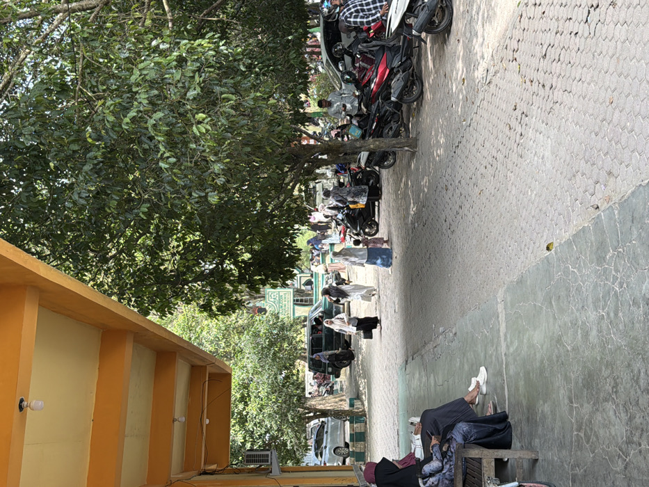 A public area shows parked motorcycles, pedestrians, and people sitting. A building with yellow and orange walls is on the left. Trees provide shade. Some individuals wear hijabs, while others are dressed in casual clothing. The ground is paved. The scene suggests a gathering or a public space where people are engaging in different activities.