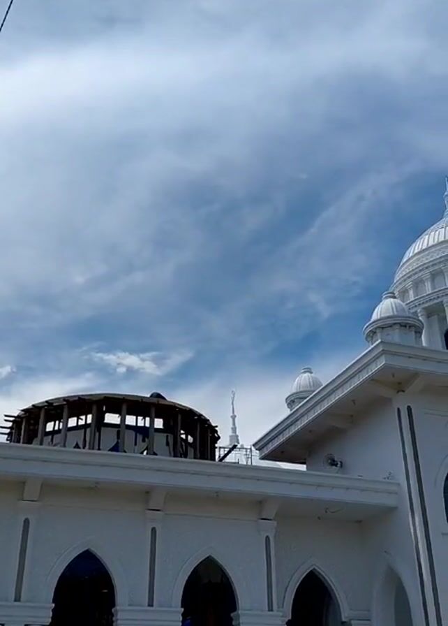 The camera slowly pans upward, revealing the white walls and arches of a mosque building. A partial, dark wooden framework is visible to the left. The focus shifts to a large, white dome with supporting columns, and a sign reading "MASJID BESAR AL-FURQAN". The sky above is blue with scattered clouds.