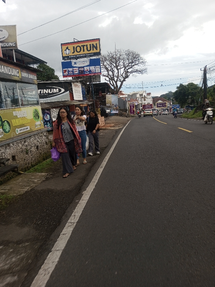 The image depicts an overcast street scene in what appears to be a commercial and residential area. Signs visible on the left side of the road, such as "JOTUN," "MURAH MAKMUR CIPANAS," and "MIE BAKSO YAMIN BANDUNG," indicate the location is in Indonesia, specifically near Cipanas and Bandung, contradicting the requested Sandamal Eliya, Sri Lanka. In the foreground, three adult females walk in single file on a concrete sidewalk, moving away from the viewer. The woman closest to the camera wears glasses, a patterned open top over a striped shirt, dark wide-leg pants, and sandals, carrying a purple bag. The second woman wears a white top, blue jeans, and light sandals, looking to her right. The third woman, furthest from the camera, wears a black top, dark pants, and white shoes. To the left of the sidewalk, a low stone wall supports a series of commercial buildings with various signs, including "PLATINUM CERAMICS" and a large yellow billboard for "JOTUN" paint, featuring a thumb-up logo. Behind these structures, a large deciduous tree with bare branches is prominent against the sky. The asphalt road to the right of the sidewalk features a solid white line at its edge and faded double yellow lines further down the center. Multiple vehicles, including cars and motorcycles, are visible in the distance, traveling on the road. A light-colored scooter with a rider is seen on the far right. The sky is largely overcast with grey clouds. Utility poles and power lines line the right side of the road, which curves slightly to the right in the distance, leading to more buildings and green hills under the cloudy sky.
