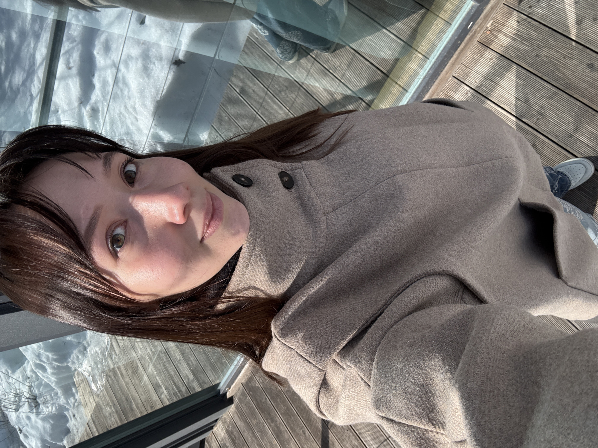 A young adult female, located in the city of Октябрьский, Russia, is depicted in a sunlit outdoor scene. She has a light complexion, long dark brown hair with bangs, and light brown eyes, looking directly at the camera with a slight smile. She wears a light taupe textured wool-blend coat featuring a high collar with two dark buttons, a dark turtleneck, blue denim jeans, and light grey sneakers. She stands on a wooden deck. Behind her, a large glass panel frames a snow-covered exterior with sparse vegetation. A partial reflection of her lower body and the wooden deck is present in the glass. The scene is brightly lit by natural sunlight, producing defined shadows.