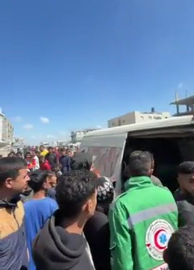 crowd of people gathered around a white ambulance with its back doors open. Some people are looking inside the ambulance. A man in a green EMS uniform stands near the ambulance doors. In the background, there are buildings, some of which appear to be damaged or under construction. The sky is blue and the sun is shining. The overall impression is a scene of emergency or assistance in a possibly unstable environment.