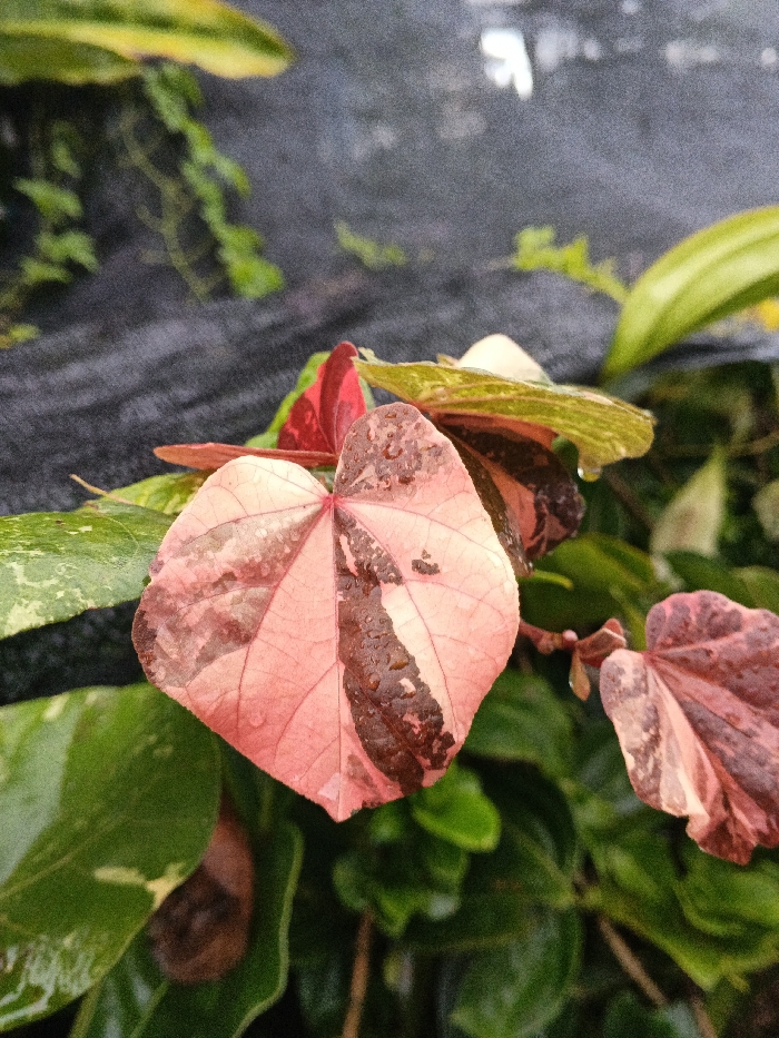 This image captures a close-up of variegated plant foliage in Stueng Saen, Cambodia. The primary subject is a heart-shaped leaf positioned centrally, exhibiting a light pink to reddish-pink base color with irregular, mottled patches of dark brown or purplish-brown. Visible veins traverse the leaf, and numerous small water droplets are present on its surface. Surrounding this central leaf are additional leaves, some displaying similar pink/reddish and dark brown variegation, while others are primarily green, with some showing lighter green or yellowish streaks. Several of these adjacent leaves also bear water droplets. The background is out of focus, consisting of a dark, textured surface, possibly a black mesh or fabric, partially obscured by blurred green foliage. A small, indistinct white, inverted L-shaped mark is visible in the upper right quadrant of the blurred background. No people or active interactions are depicted.