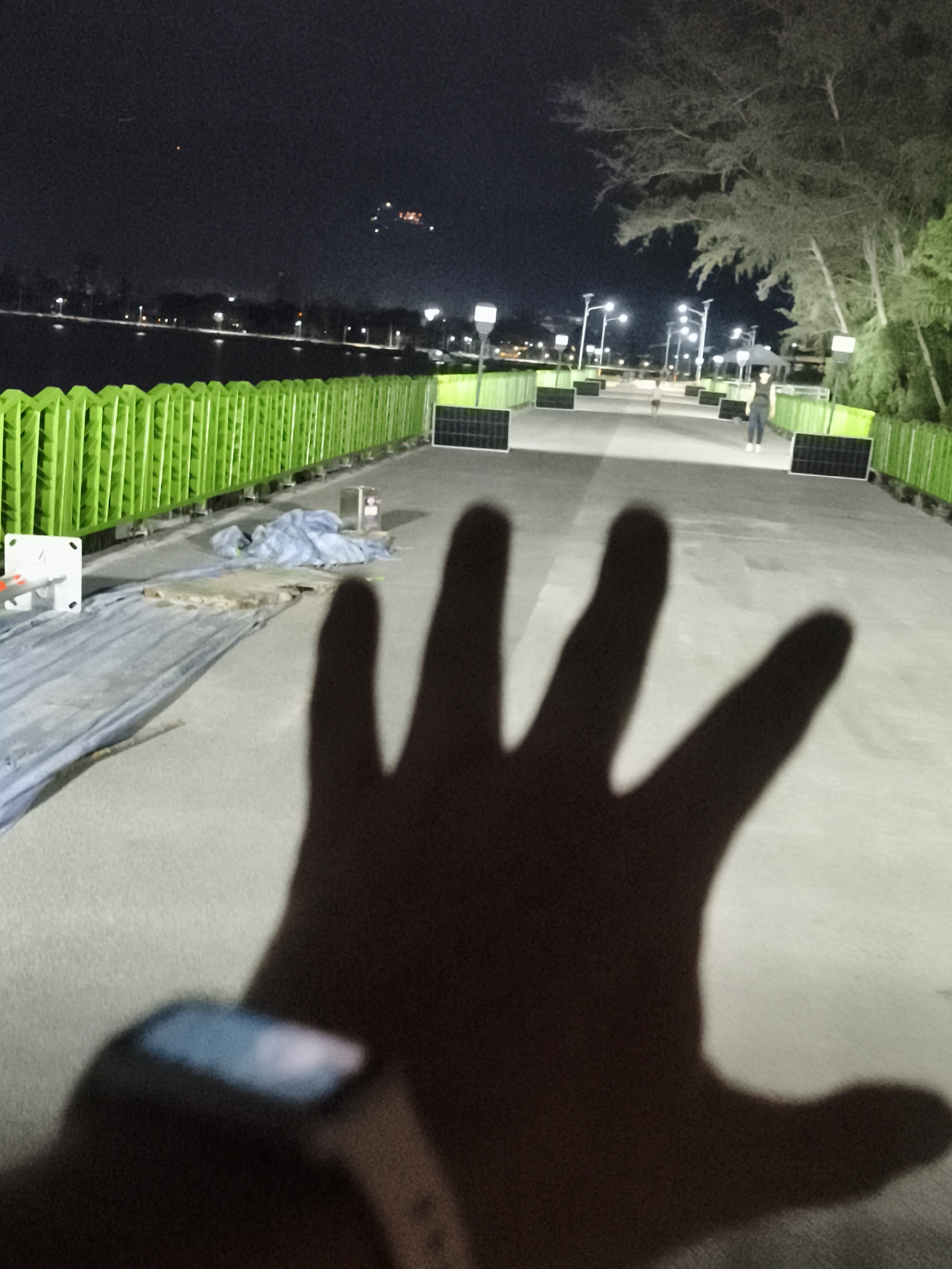 dimly lit boardwalk at night in บ้านบางรักษ์, Thailand. The boardwalk is lined with a green railing and solar panels. A person is walking in the distance, and a dog is ahead of them. In the foreground, a person's hand and wrist with a watch are obscuring the view. Construction materials covered in a tarp are near the railing. Streetlights are visible along the boardwalk and across the water. Distant lights are visible in the sky.