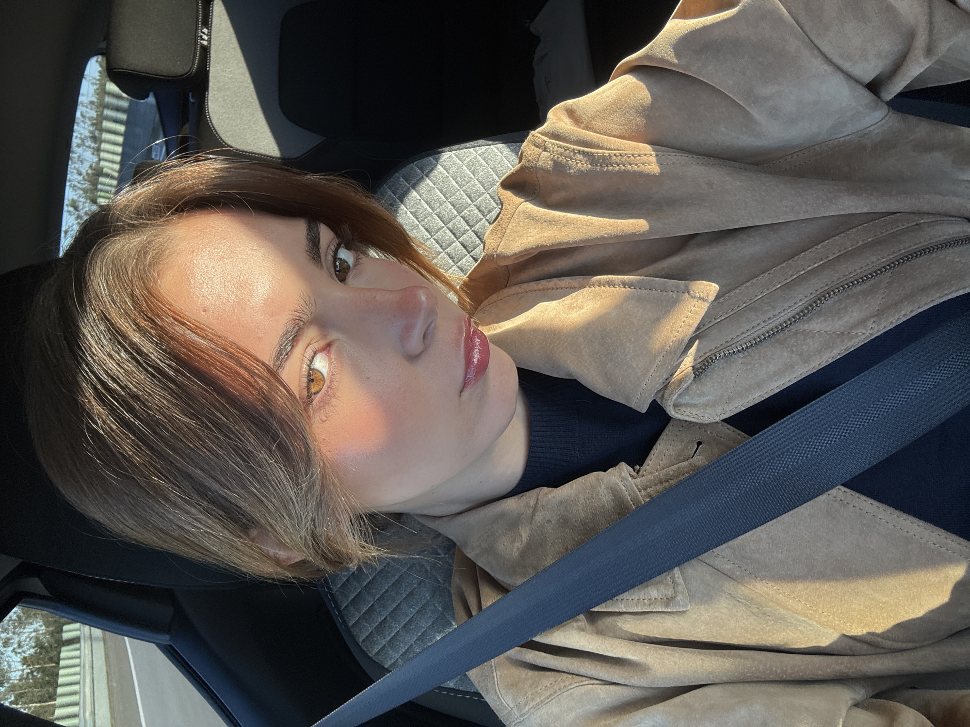 A young woman is wearing a brown suede jacket and a navy blue sweater while secured in a car with a blue seatbelt