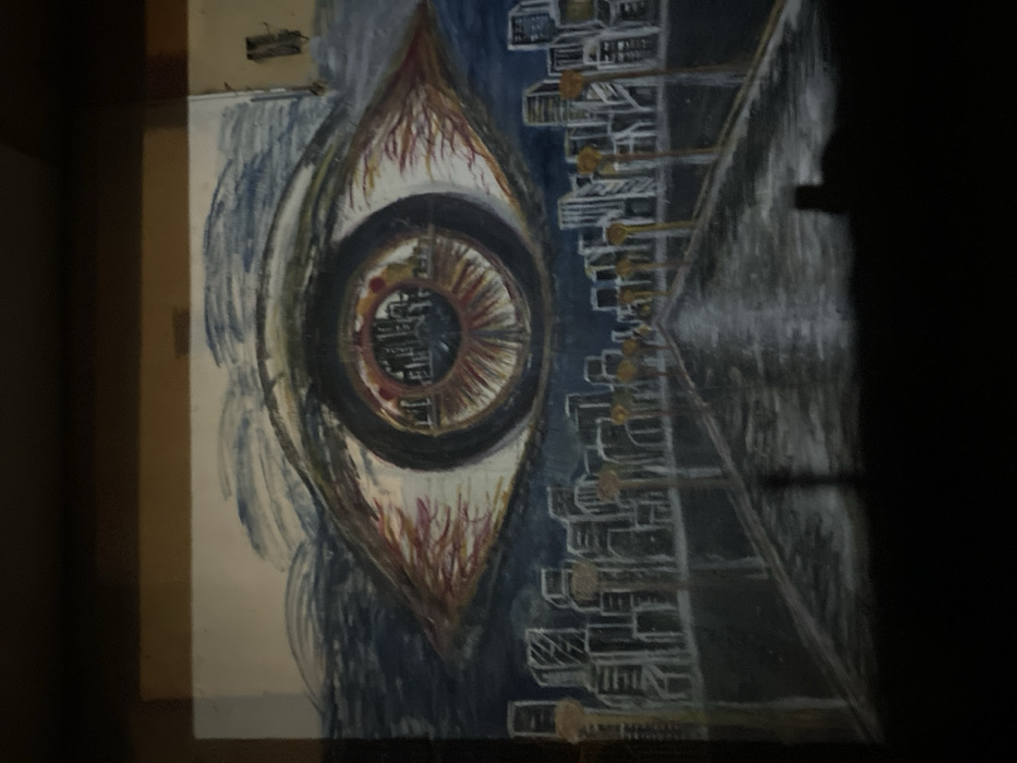 An abstract drawing shows a stylized eye with a city reflected in the iris. Veins protrude from the eye, painted in shades of red and brown. Next to the eye, a cityscape with buildings and streetlights stretches into the distance, reflected in a body of water. The palette consists of whites, grays, blues, and browns. The drawing is slightly tilted, and the top left corner displays a piece of the surface it rests on.