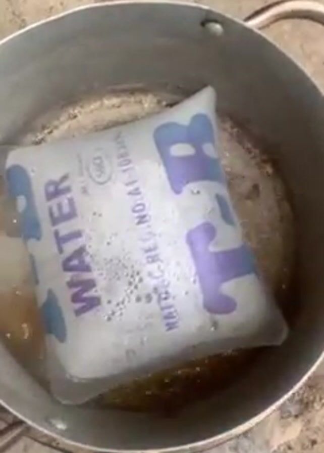 A sachet of drinking water is being boiled in a pot of water on a portable gas stove