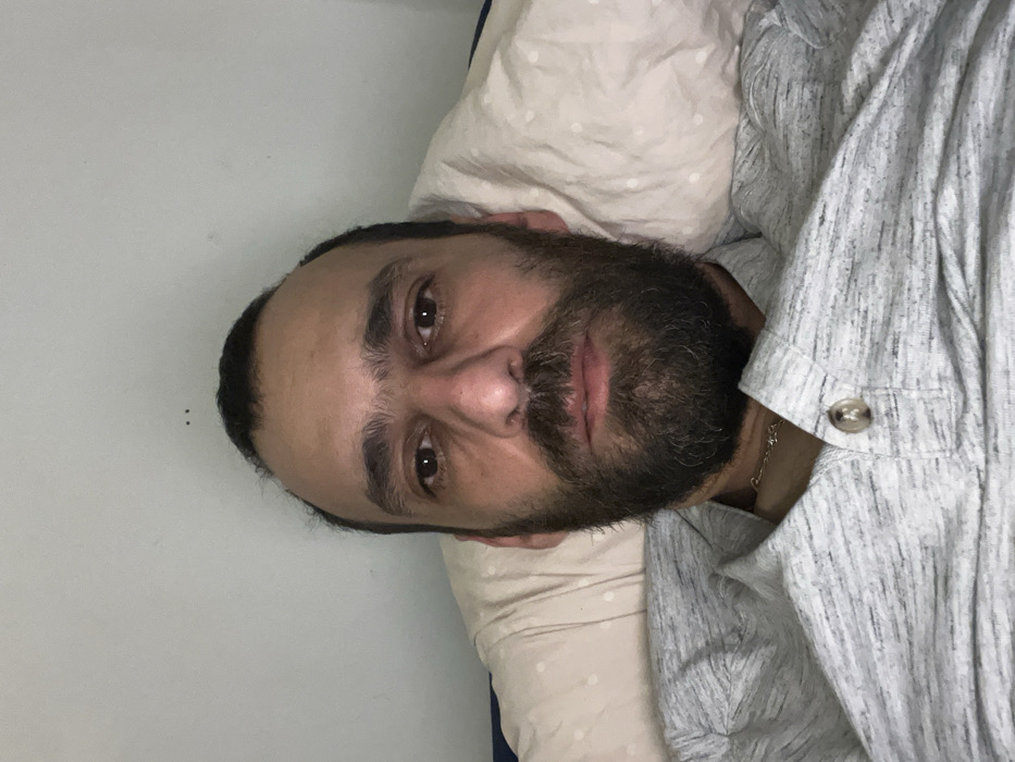 An adult male is depicted in a close-up, head-and-torso shot, lying down indoors in Schaerbeek - Schaarbeek, Belgium