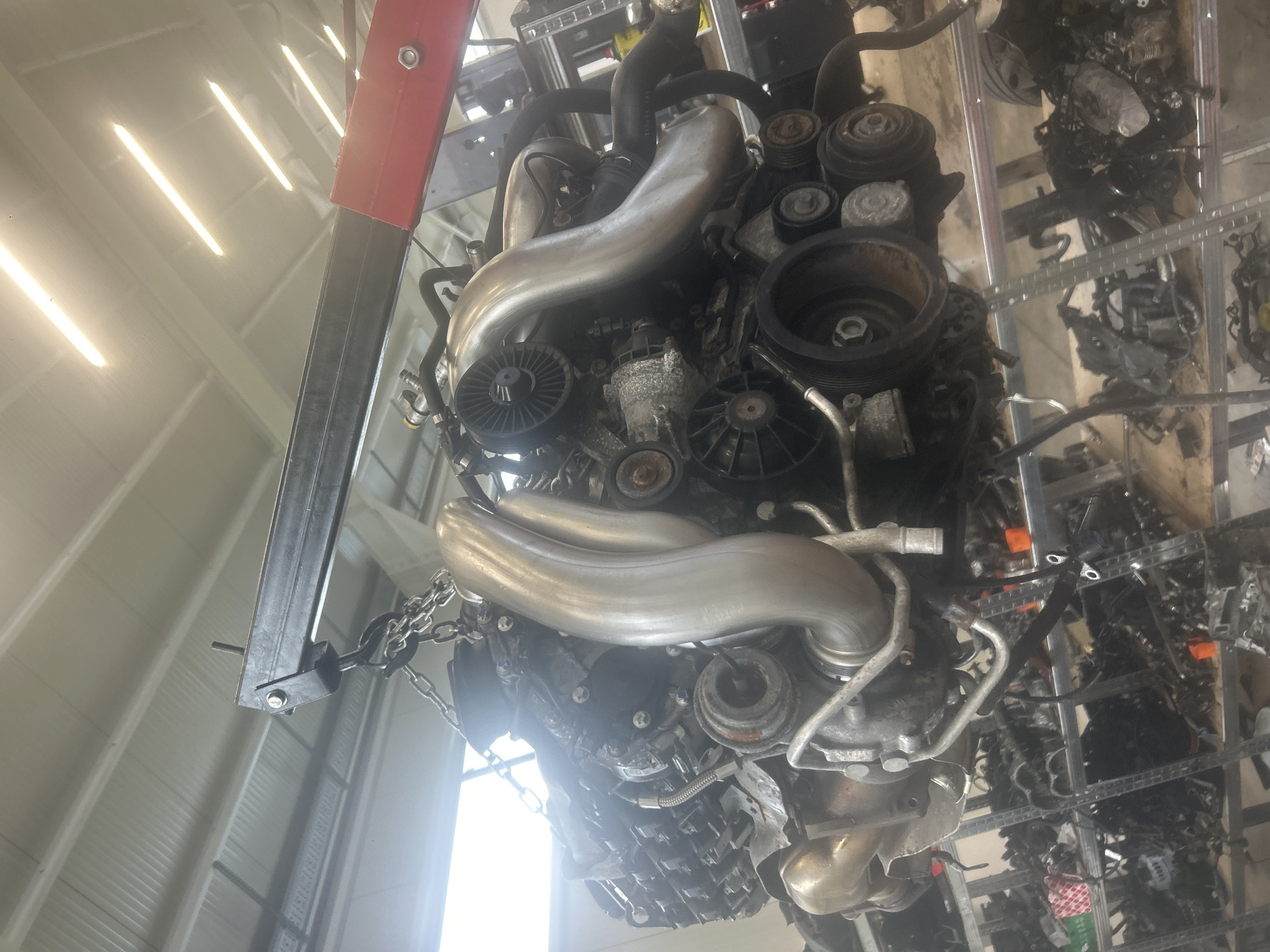 n engine suspended by a chain from a red and black engine hoist. The engine is dirty and covered in various hoses, belts, and pulleys. In the background, a metal rack system holds various engine parts. The image was likely taken indoors, in a storage or workshop environment. While the prompt mentions Tsaratsovo, Bulgaria, that information cannot be confirmed from the visual data of the image. There are no visible people, actions, or interactions captured in the picture.