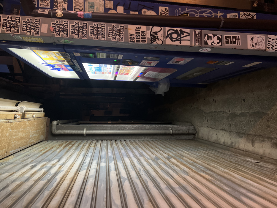 This image depicts a narrow urban alleyway located in Chiyoda, Japan. On the left, a corrugated metal roll-down security shutter, light-colored with visible rust and grime, extends vertically. A gray downspout runs parallel to this shutter. On the right, a tall, blue, illuminated vending machine dispenses beverages. Its right side and an adjacent pillar are covered extensively with various stickers and graffiti, notably repeating "THE BLACK EYE PATCH." A white plastic bag hangs from the vending machine near its base. The concrete ground of the alleyway is dark and shows signs of wear and moisture. The background of the alley recedes into deep shadow, suggesting low ambient light or nighttime conditions. No individuals or active subjects are present.