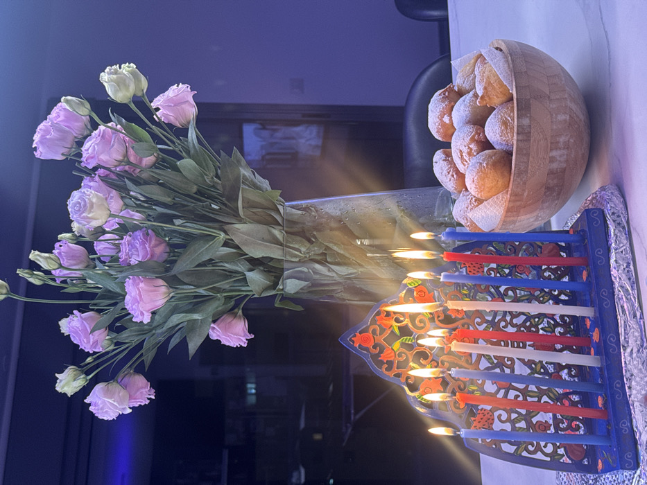 - "A table arrangement includes a vase of purple lisianthus flowers, a wooden bowl filled with powdered donuts, and a lit Hanukkah menorah" by FM-v1KIi2, licensed under CC BY 4.0